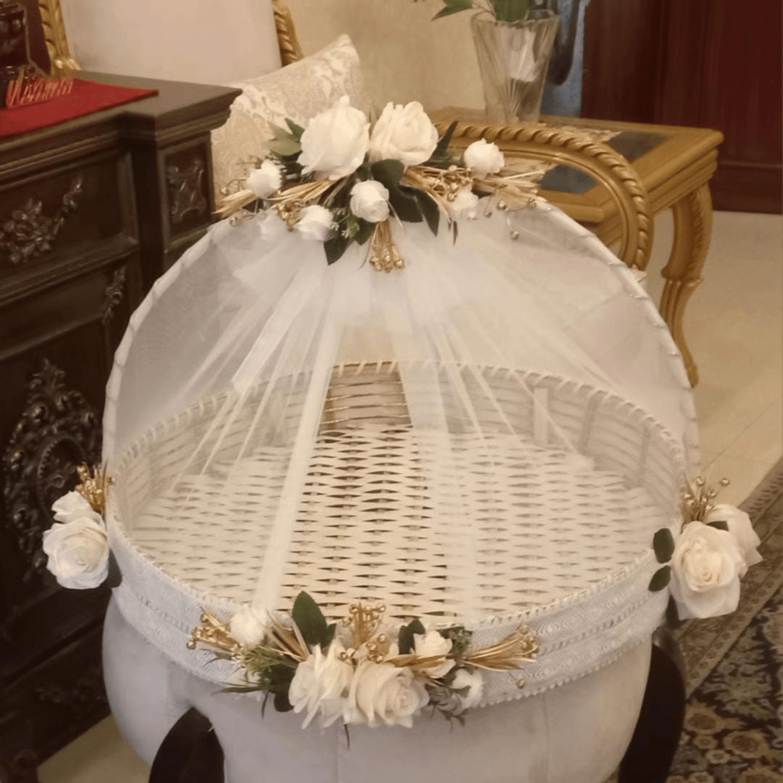 • 1x Fabric Net • 5x Imported Flowers Bunch • 1x Medium Round Wooden Basket