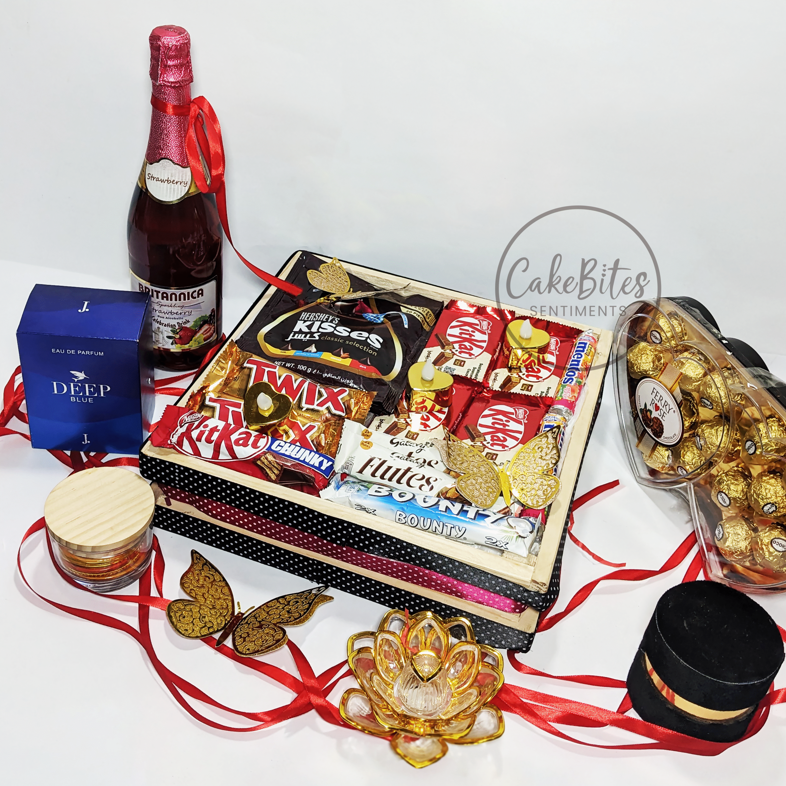 • 1x Bounty • 2x Galaxy Flutes • 1x Hershey Kisses Cookies’n’Crème • 4x KitKat 4f • 1x KitKat Chunky Krunch • 2x Mentos Mix Fruits • 2x Twix • 3x Heart Warm LED Candle • 2x Butterfly • 1x Ribbon • 1x Medium Square Wooden Basket