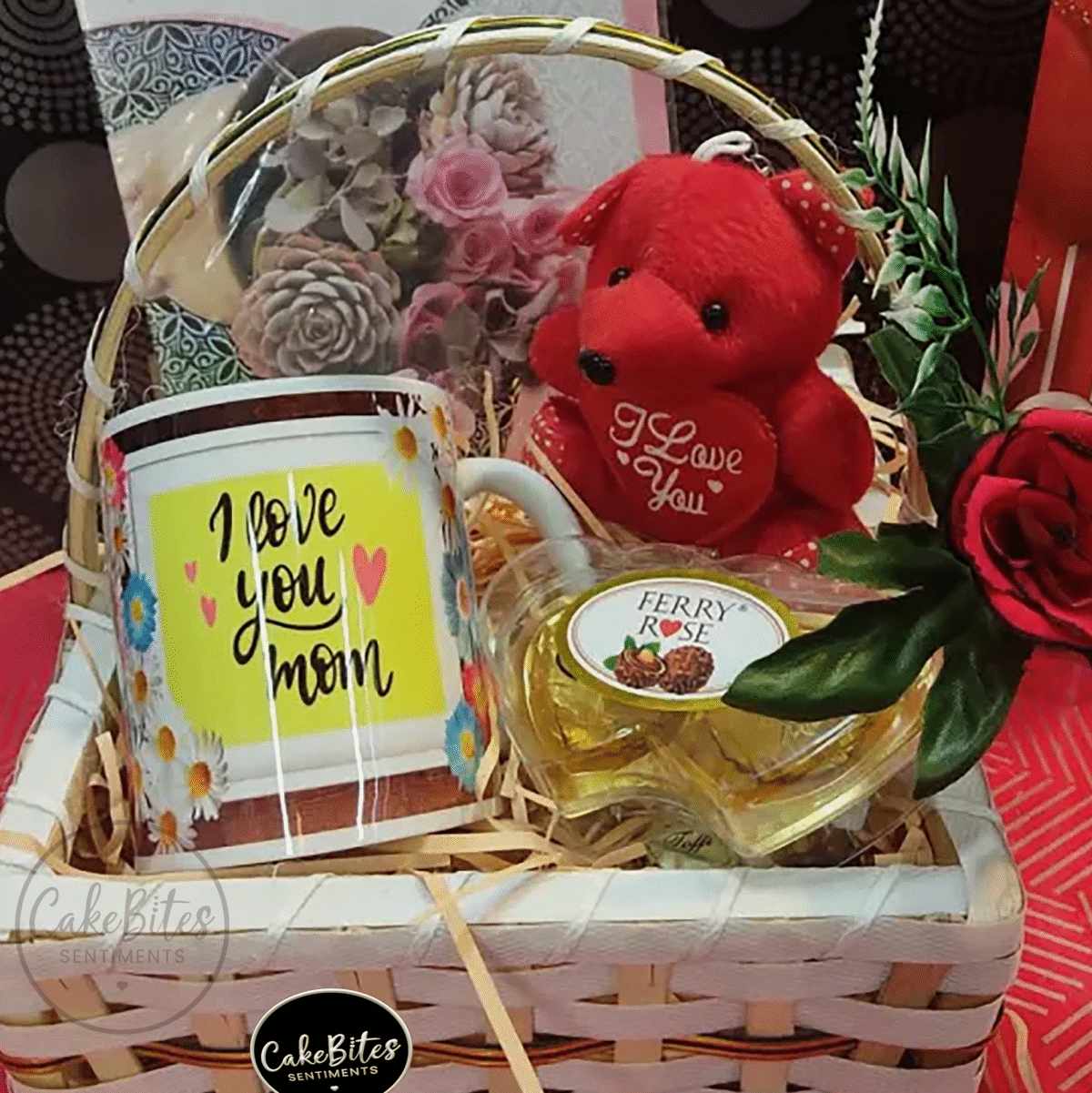 • 1x Ferry Rose T5 Pack • 1x Teddy Bear Small • 1x Wish Card • 1x Small Square Wooden Basket