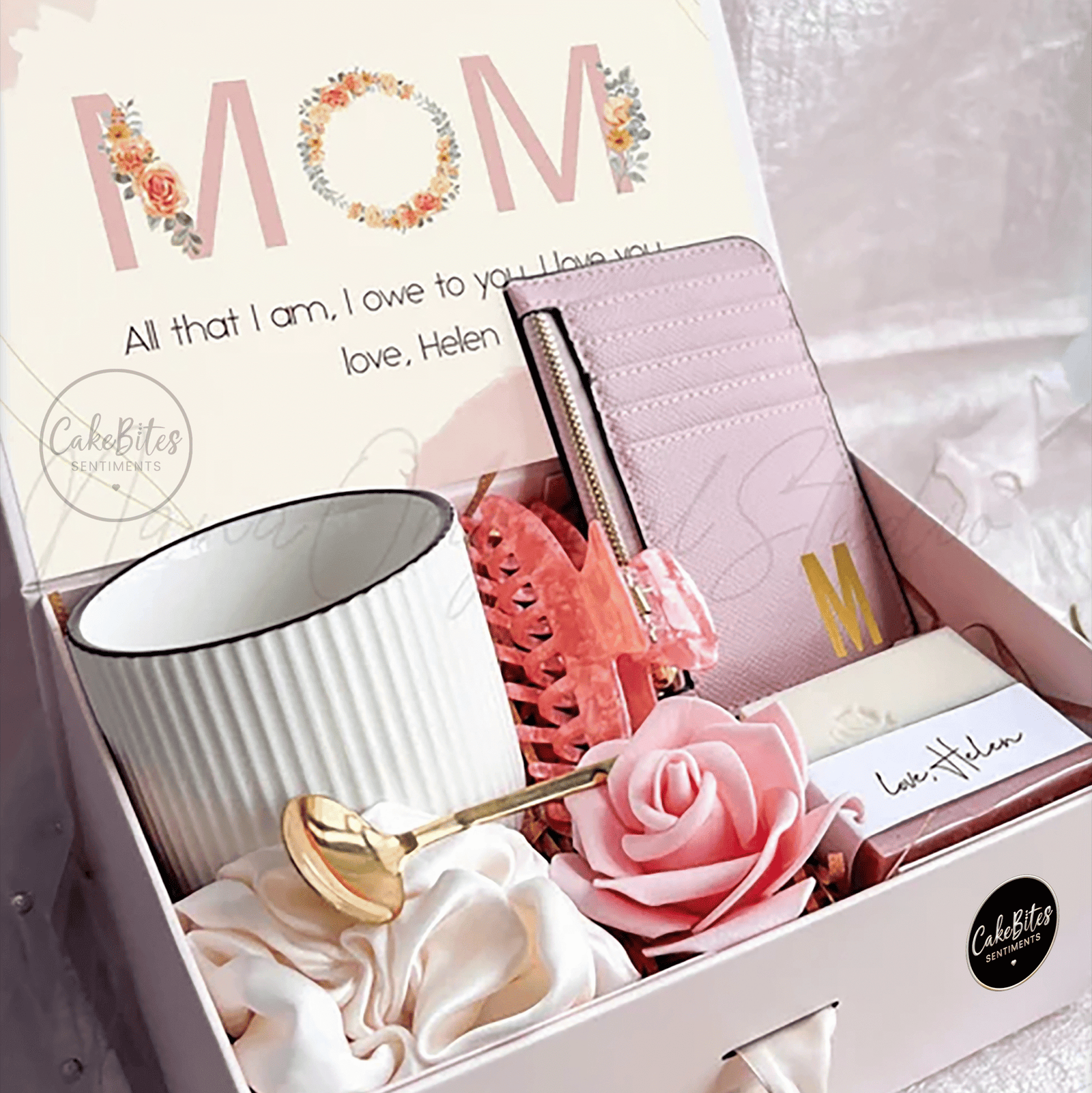 • 1x Scented Candle • 1x Handmade Foam Flowers • 1x Customized Small Hampers Box • 1x Customized Coffee Cup • 1x Branded Wallet • 1x Hair Catcher • 1x scrunchies